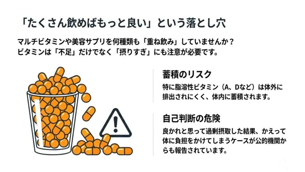 マルチビタミンなどは不足を補う助けになる一方で、製品の内容や組み合わせによっては、過剰摂取につながることもあります。