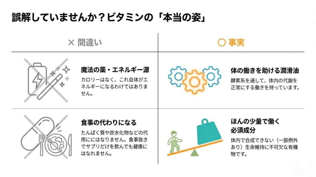 ビタミンはあくまで、体の働きを助ける大切な栄養素のひとつです。