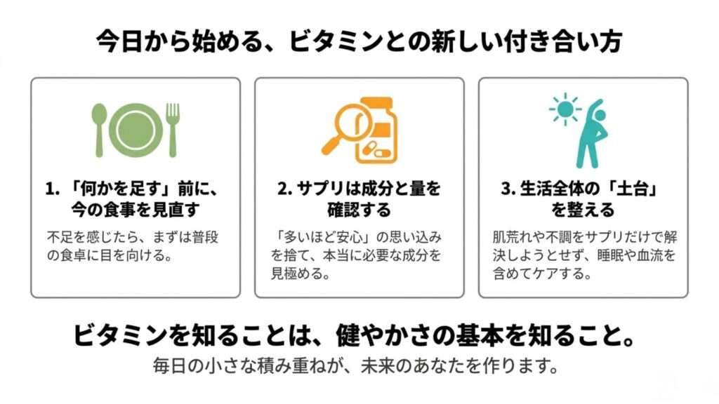 とくに、脂溶性ビタミンの一部は体にたまりやすいため、自己判断で多く摂り続けるのは注意が必要です。