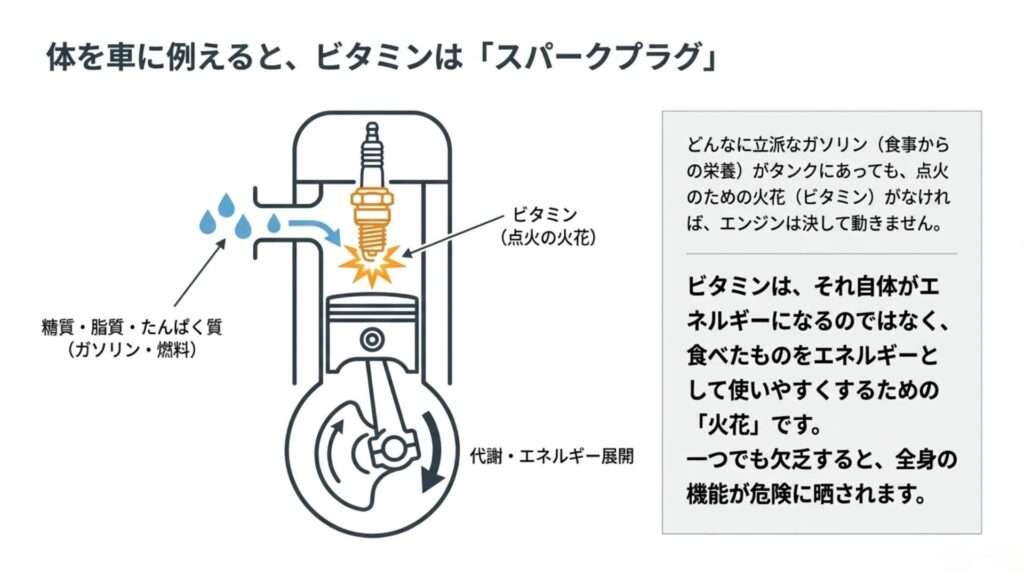 よく、ビタミンは「体のエンジンを回す火花のようなもの」とたとえられることがあります。